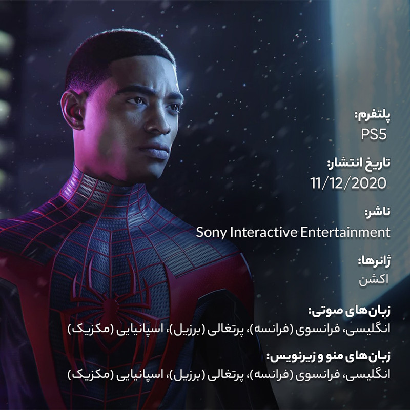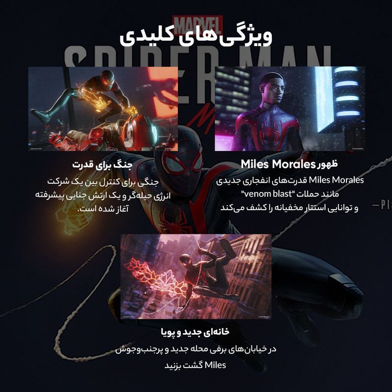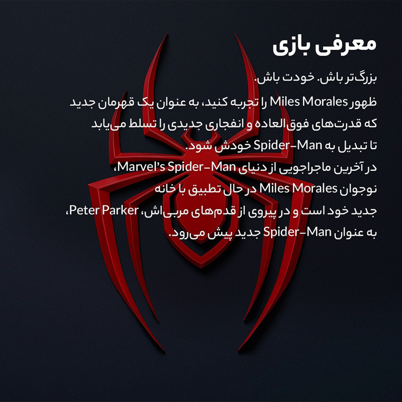 در بازی Spider-Man: Miles Morales، پیدایش مایلز مورالس را که در حال کشف قدرت‌های جدیدش است تا تبدیل به مرد عنکبوتی جدید شود، تجربه خواهید کرد., در جدیدترین ماجرای دنیای مرد عنکبوتی، مایلز مورالس نوجوان در حال خو گرفتن با محله جدیدش است و قصد دارد تا با دنبال کردن راه پیتر پارکر، تبدیل به مرد عنکبوتی جدید شود. اما زمانی که یک نیروی قدرتمند کمر همت به نابودی شهر مایلز مورالس می‌بندد، مایلز متوجه می‌شد که قدرت عظیم، مسئولیت عظیمی نیز به دنبال دارد. برای نجات نیویورک، مایلز باید تبدیل به مرد عنکبوتی متفاوت و منحصربفردی شود., ظهور مایلز مورالس, مایلز مورالس متوجه می‌شود که قدرت‌هایی کاملا متفاوت از پیتر پارکر دارد. او دارای قدرت‌های بایوالکتریکی و نامرئی شدن و استتار است که منحصر به او هستند و مایلز باید در کنار تار انداختن و گجت‌های مختلفش، از این قابلیت‌ها نیز استفاده کند., نبرد قدرت, نبردی برای کنترل نیویورک بین یک کمپانی انرژی شرور و یک ارتش جنایت‌کار مجهز به تکنولوژی‌های بسیار پیشرفته شکل گرفته است. محله مایلز مورالس در قلب این نبرد است و مایلز برای نجات آن باید تبدیل به یک قهرمان شود و بهای رسیدن به خوبی والاتر را پرداخت کند., خانه‌ای جدید و رنگارنگ, مایلز در محله‌های برفی و نورانی نیویورک به دنبال حس تعلق تار می‌اندازد و با محله و همسایه‌های جدیدش آشنا می‌شود. زمانی که مرز بین مایلز مورالس و مرد عنکبوتی کم‌رنگ‌تر و کم‌رنگ‌تر می‌شود، مایلز در‌می‌یابد که به چه کسانی می‌تواند اعتماد کند و خانه چه معنایی برای او دارد., قهرمان‌های داستان, مایلز مورالس: مایلز، مرد عنکبوتی جدید در نیویورک است. پس از مرگ نابه‌هنگام پدر مایلز، او با پیتر پارکر آشنا می‌شود و این دو با هم دوست می‌شوند و پیتر، مایلز را زیر بال و پر خود می‌گیرد. زمانی که عنکبوتی جهش یافته، مایلز را گاز می‌گیرد، مایلزقدرت‌های خاصی به دست می‌آورد و پیتر قبول می‌کند تا او را آموزش دهد. مایلز ماجراهای جدید خود را در هارلم شرقی آغاز می‌کند و باید با مسئولیت‌هایی چون حفظ دوستی‌هایش، داشتن یک سیاست‌مدار در خانواده و حفظ تعادل بین زندگی شخصی و ابرقهرمان بود را بر عهده بگیرد. با شروع یک نبرد قدرت که ممکن است باعث نابودی نیویورک شود، مایلز باید تبدیل به یک مرد عنکبوتی جدید شود یا همه چیز را از دست بدهد.