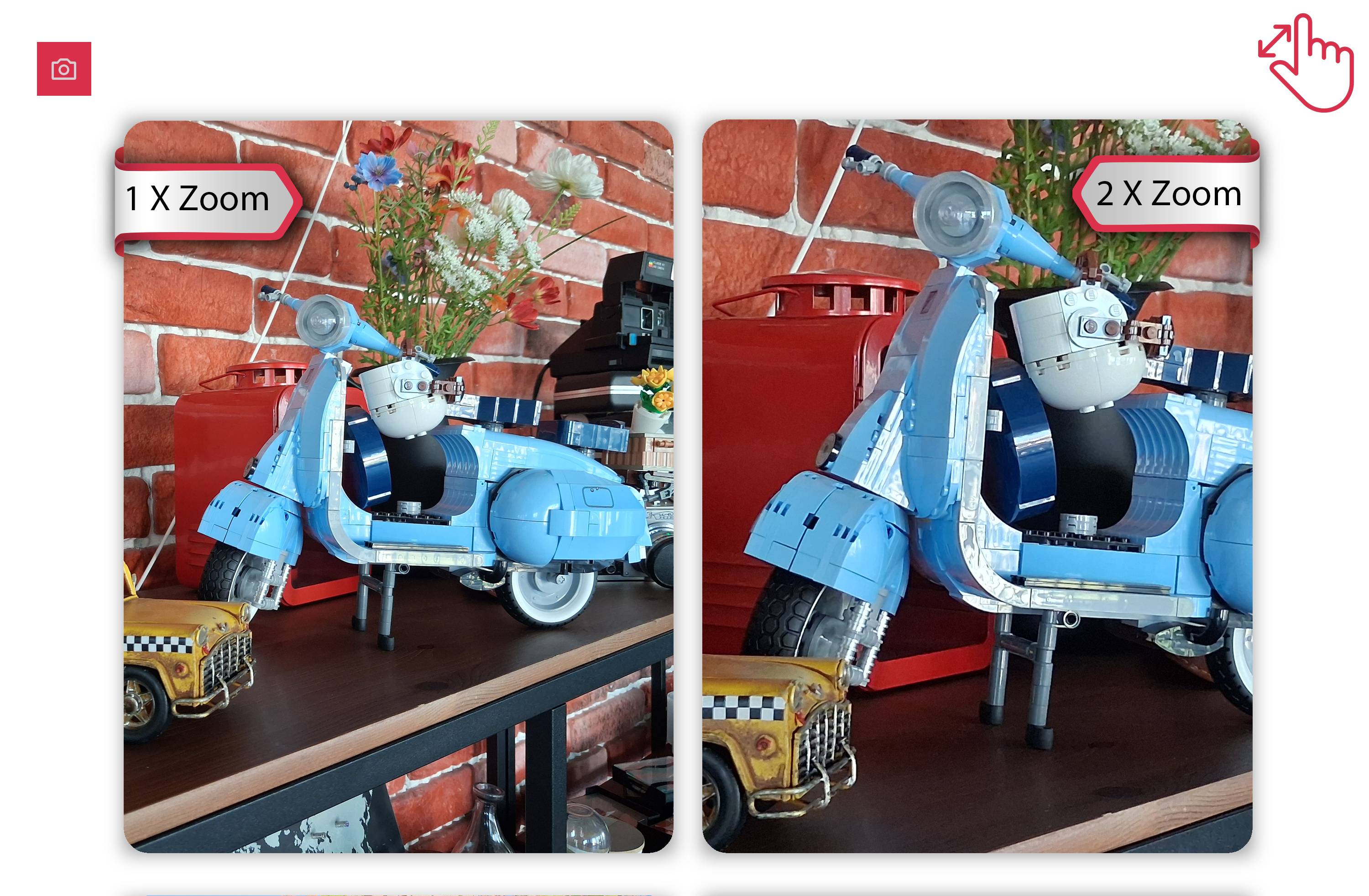 این گوشی برای زوم، از برش دیجیتال سنسور اصلی استفاده میکند. عکسهای زوم ۲ برابری برای اشتراکگذاری عادی در شبکههای اجتماعی به اندازه کافی مناسب هستند، اما عالی نیستند. این تصاویر ویژگیهای خوب دوربین اصلی (مانند رنگها) را به ارث میبرند، اما هنگام زوم کردن، وضوح به طور قابل توجهی کاهش مییابد. استفاده از زوم ۲ برابری در شب به دلیل افت شدید کیفیت، توصیه نمیشود.